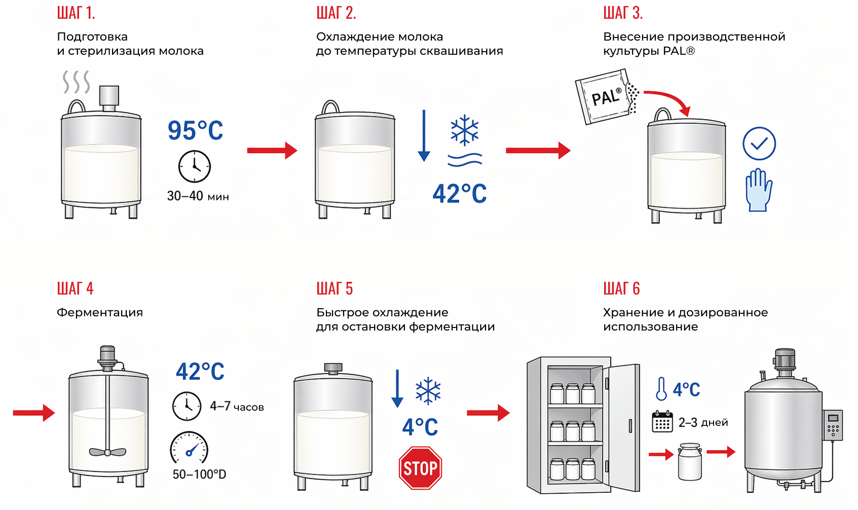 Метод приготовления производственной закваски основан на однократной активации лиофилизированной культуры в стерильной среде с последующим получением объема, достаточного для работы предприятия в течение 2–3 суток. Готовая закваска хранится в охлаждаемых емкостях при температуре 4°C и дозированно подается в сырные ванны или танки для сквашивания по мере необходимости.